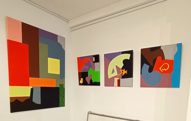SbB : en face : "AlphArchéogrAphie" : 3 peintures acrylique et huile sur toile, 40X40cm - "Phrase urbaine" : collage N&B - "Vignette" : collage couleurs 30X30 cm sur côté droit de la vitrine